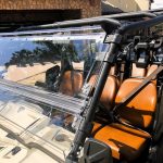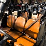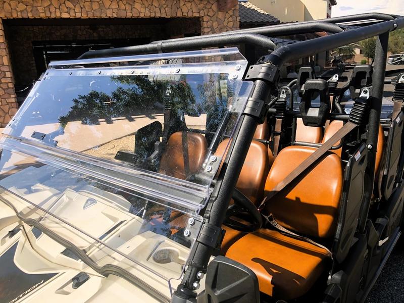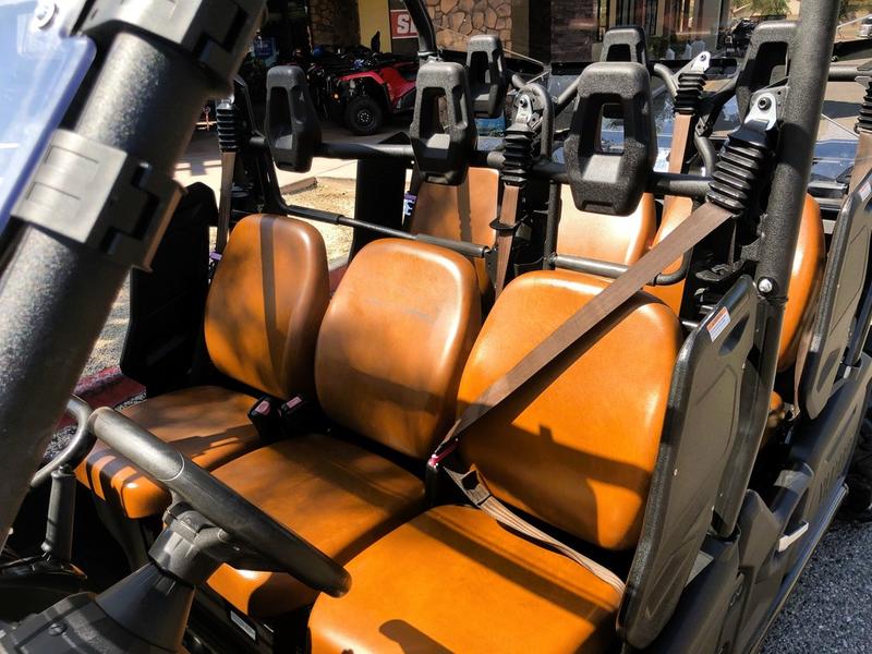 This 6-occupant machine achieves driver and passenger comfort with a class leading 115.6″ wheelbase that smooths the ride and allows for best-in-class interior space. Both front and rear center seats are offset, as are the middle headrests, allowing for unmatched middle passenger comfort and convenience. All passengers have a 3-point seatbelt for riding comfort, and extensive noise and vibration reduction measures provide a smooth and quiet ride. Front and rear passengers also have the convenience of an integrated handhold with hand-cushions that enhance comfort.