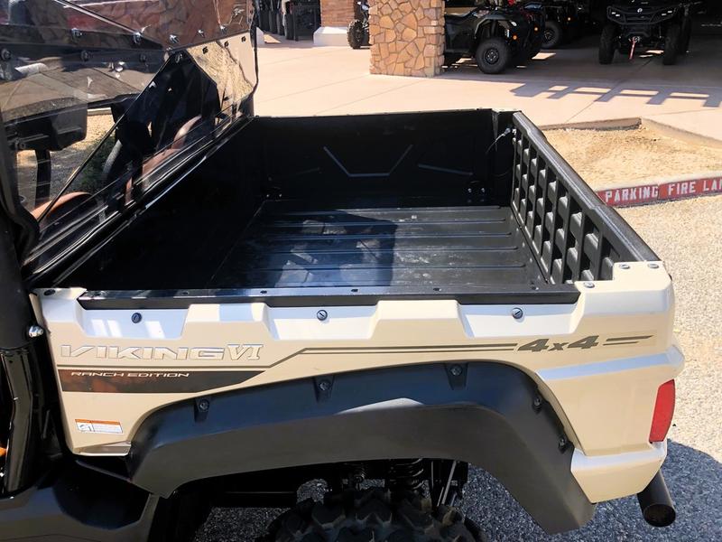 The Viking VI EPS Ranch Edition features high-quality painted bodywork with a matched interior, aluminum wheels, a soft sun top, rear view center mirror, overfenders, underseat storage, a bed grab bar and an aggressive front brush guard—all topped off with unique Ranch Edition badging.